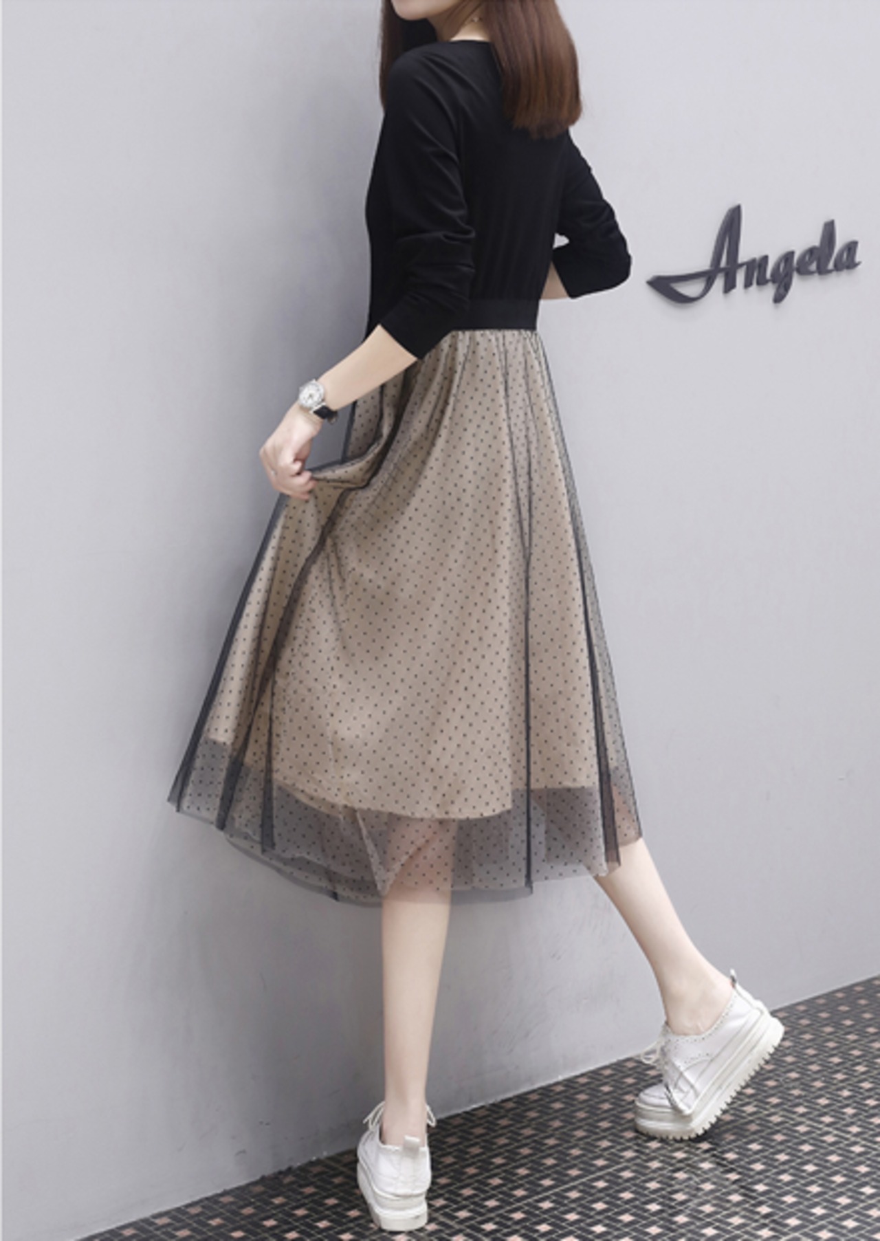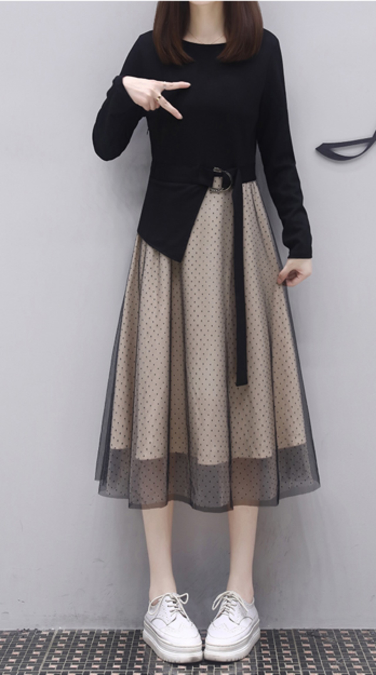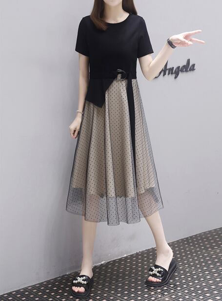ワンピース チュールスカート ミドル丈 袖あり 半袖 ラウンドネック 襟なし Aライン チュール ウエストマーク 切り替えデザイン 無地 ドット柄 夏 10代 20代 30代 レディース 女性用 通勤 学生 通学 デート お出かけ 女子会 お泊まり 休日 パーティー イベント ファッション スタイル モテ プレゼント サイズ S M L XL 2XL 3XL