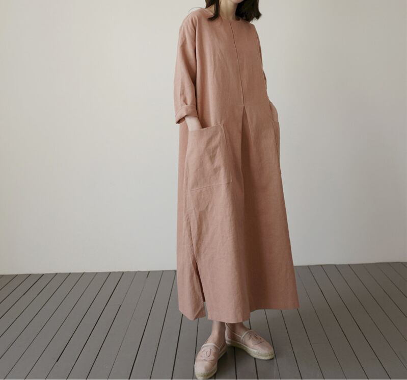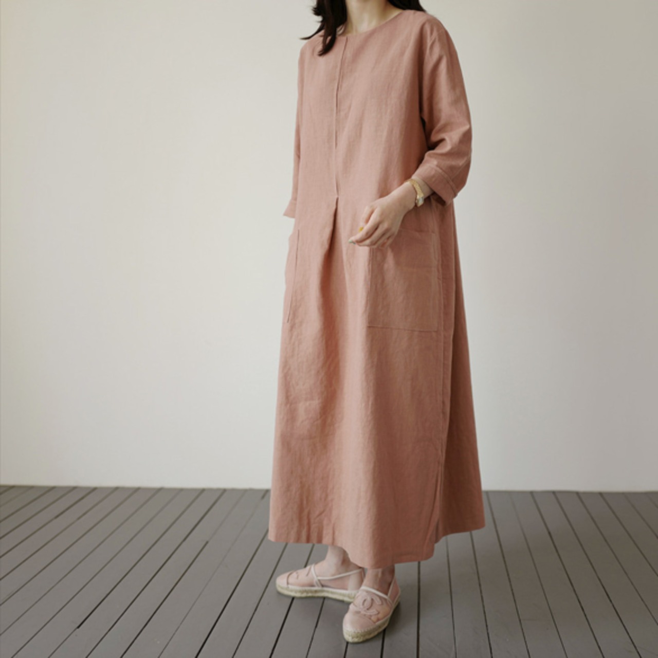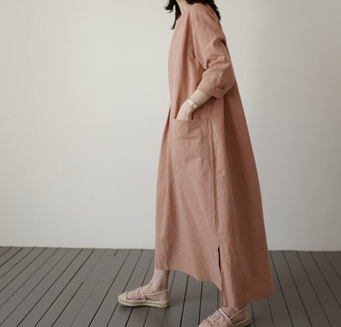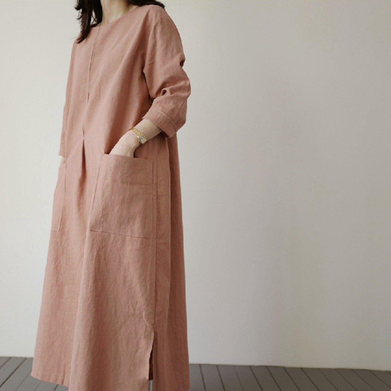 ワンピース フレアワンピース ワンピドレス ロング ロング丈 袖あり 長袖 ラウンドネック 襟なし ストレート スリット ポケット 綿 リネン 大人可愛い 大人 おしゃれ 大人女子 ルーズ 無地 春 秋 10代 20代 レディース 女性用 OL 通勤 学生 通学 デート お出かけ 女子会 お泊まり 休日 旅行 普段使い 韓国系 楽ちん 体系カバー サイズ フリーサイズ ブラック オフホワイト ピンク