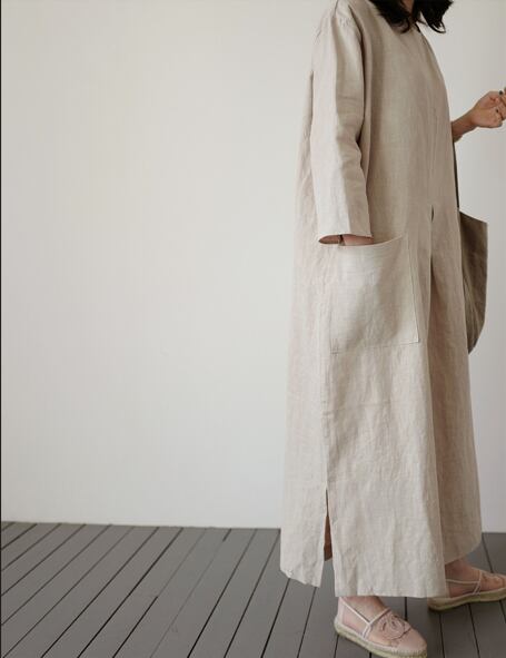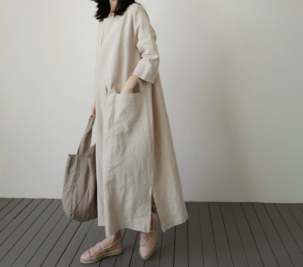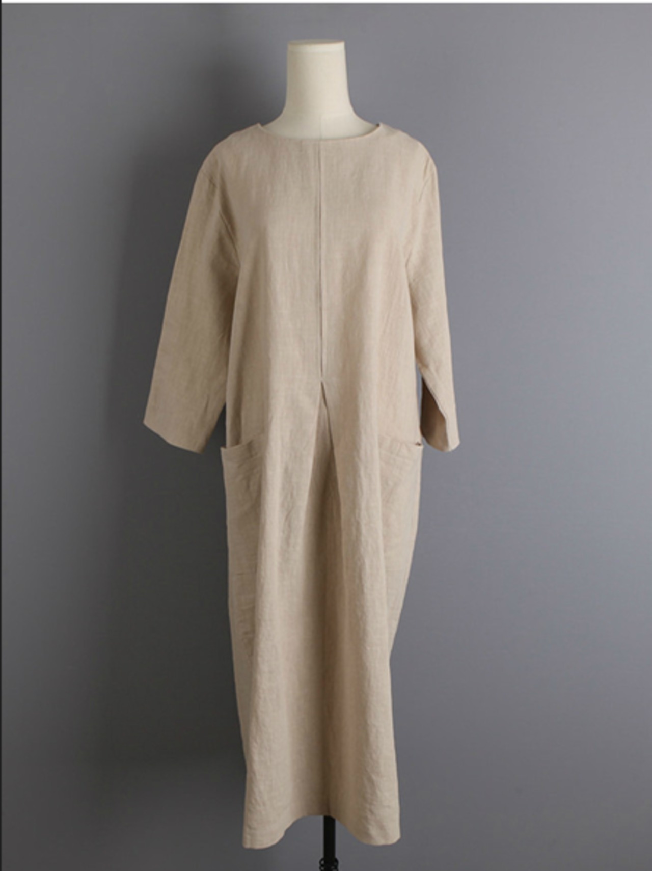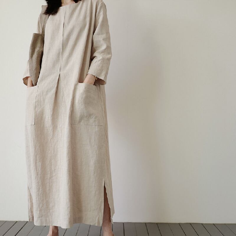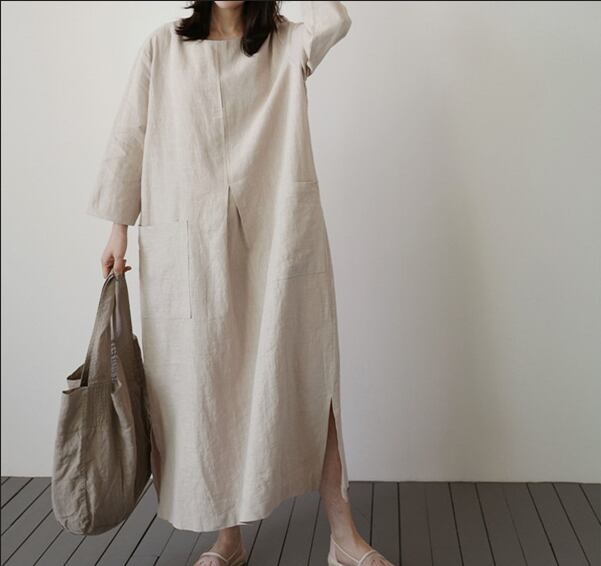 ワンピース フレアワンピース ワンピドレス ロング ロング丈 袖あり 長袖 ラウンドネック 襟なし ストレート スリット ポケット 綿 リネン 大人可愛い 大人 おしゃれ 大人女子 ルーズ 無地 春 秋 10代 20代 レディース 女性用 OL 通勤 学生 通学 デート お出かけ 女子会 お泊まり 休日 旅行 普段使い 韓国系 楽ちん 体系カバー サイズ フリーサイズ ブラック オフホワイト ピンク