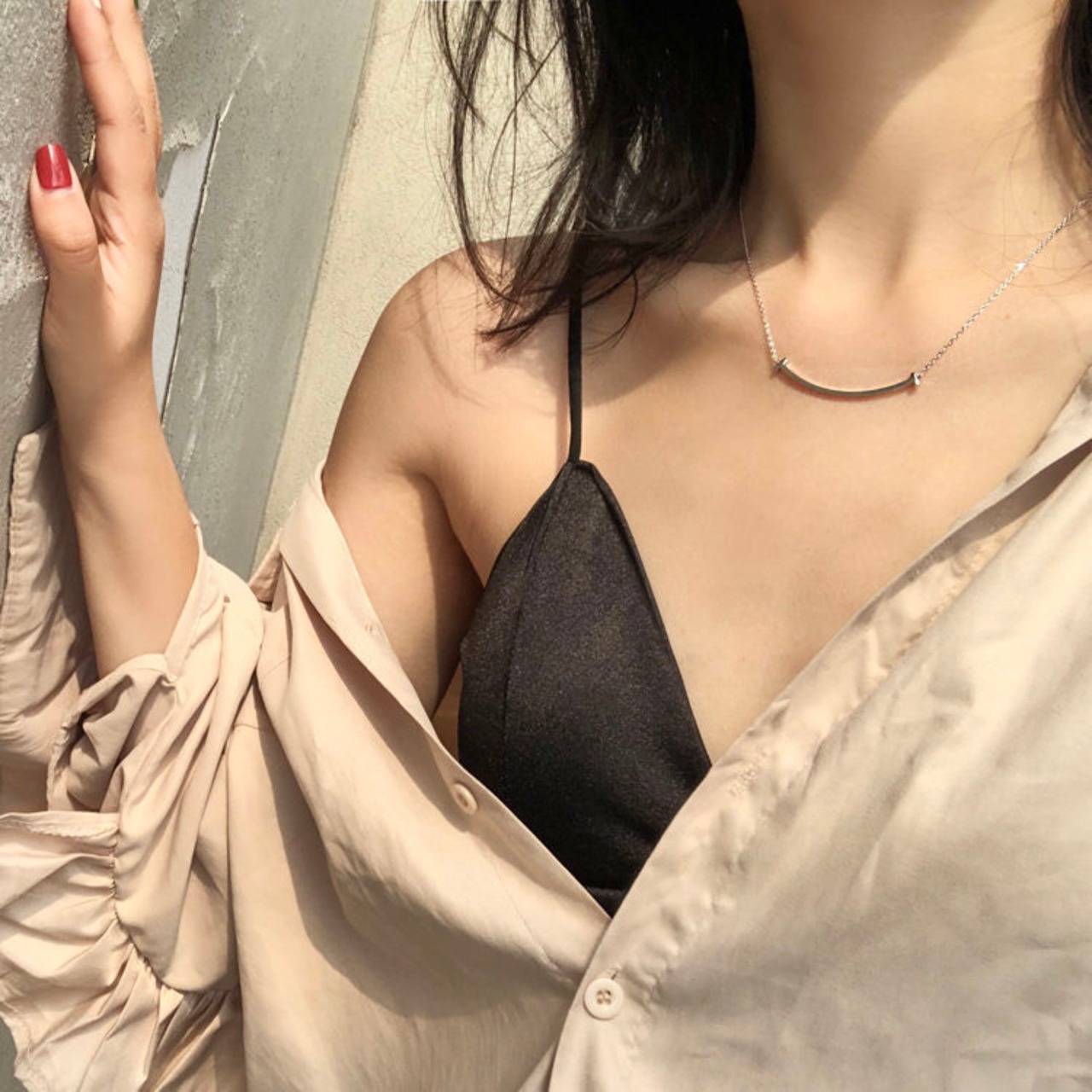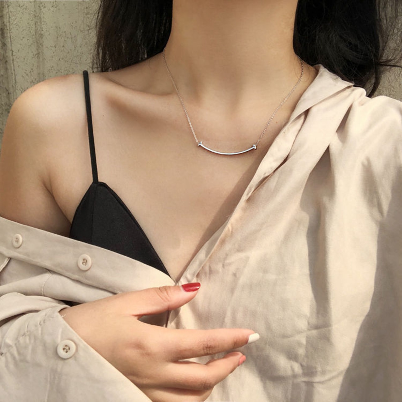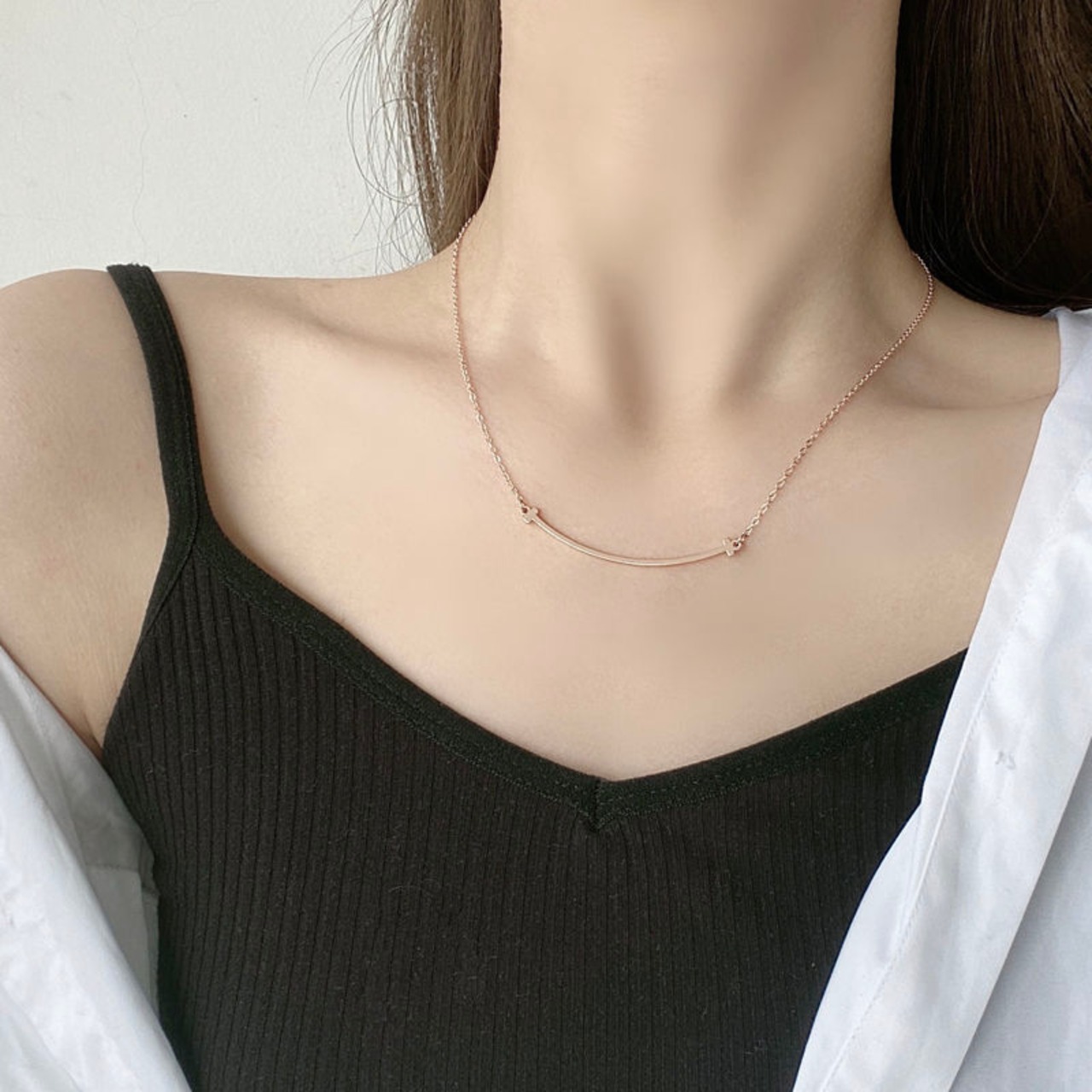 鎖骨と胸元の間にトップがくるため首回りが華奢に見えます。