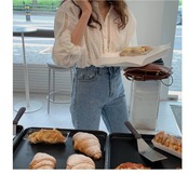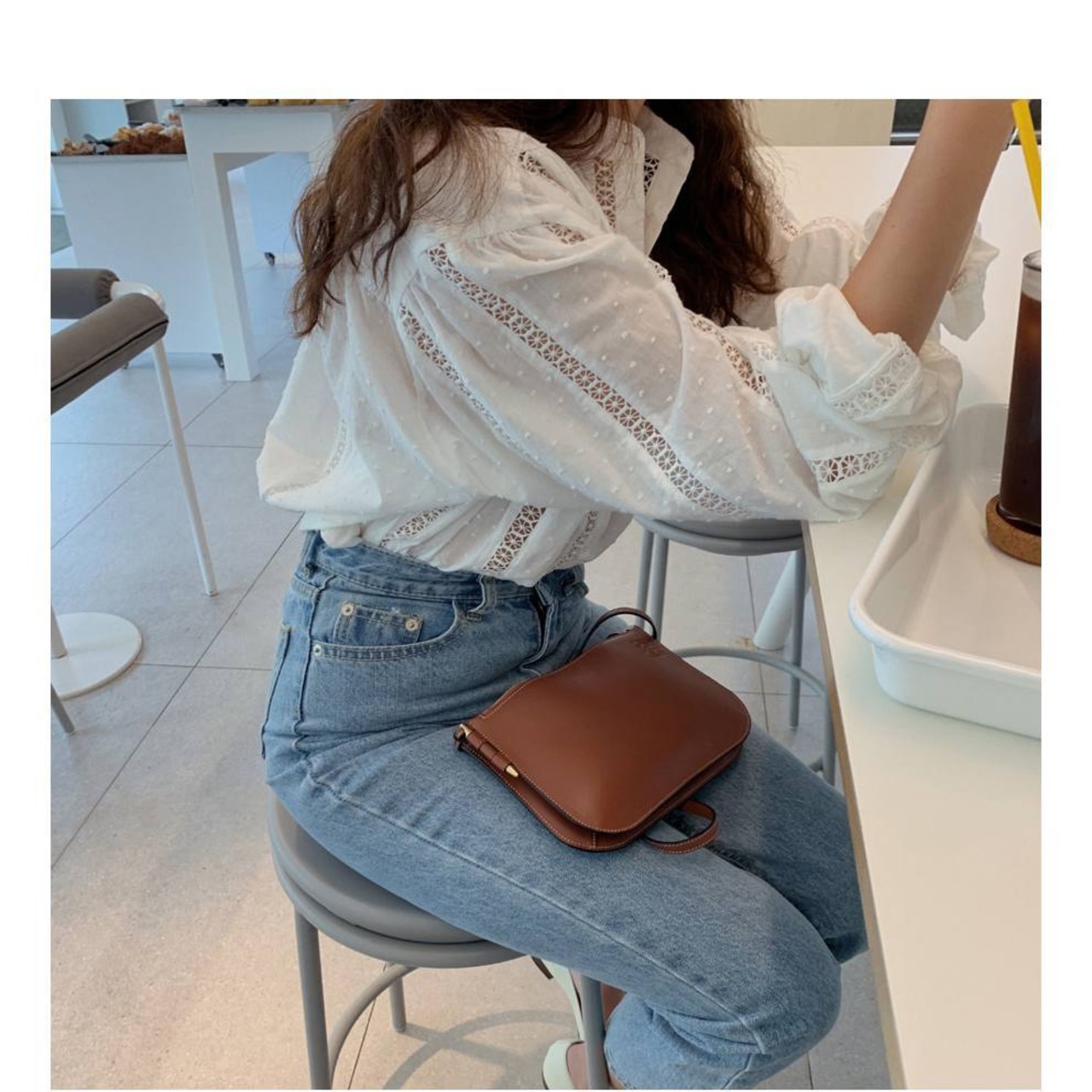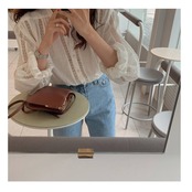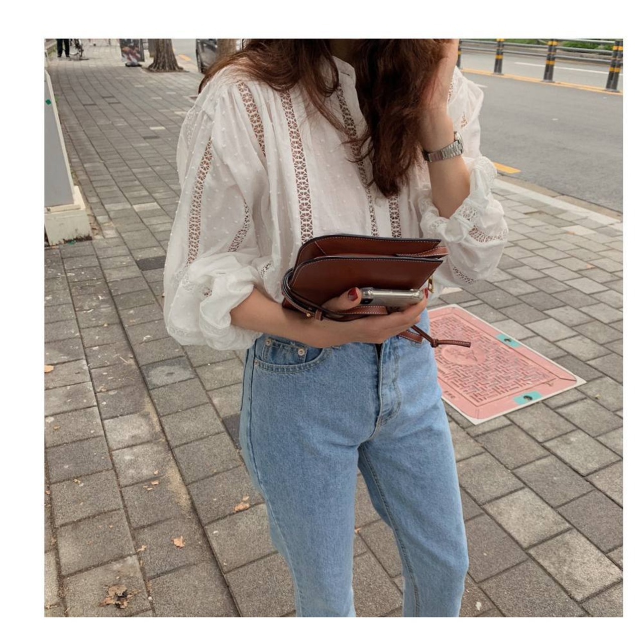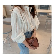 透かしレースのラインがおしゃれな長袖ブラウス。