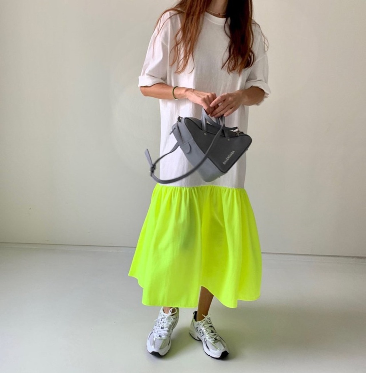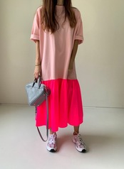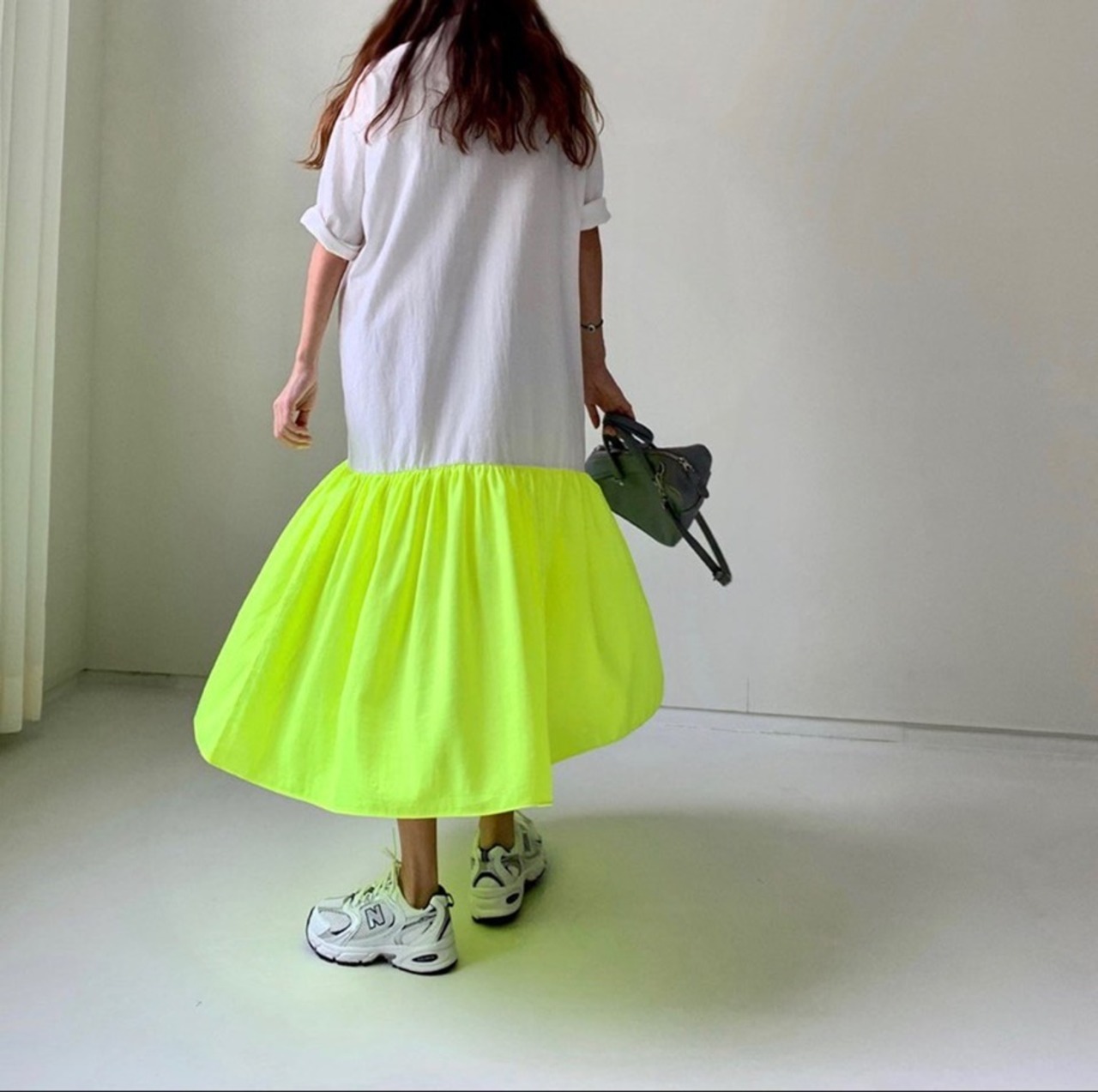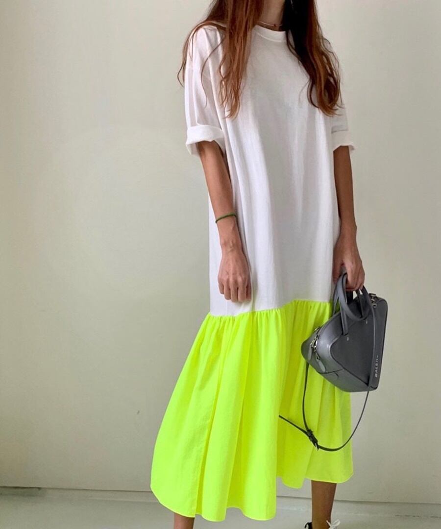 ネオンカラーの切り替えから広がる綺麗なマーメイドラインが、女性らしい雰囲気を演出します。