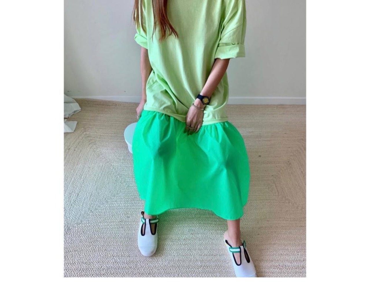 シンプルなデザインでありながら、鮮やかなカラーが目を引くTシャツワンピースです。
