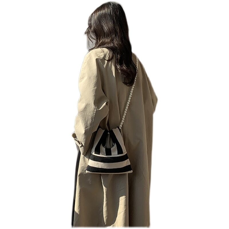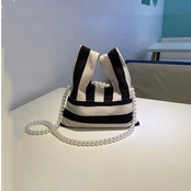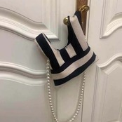 パールチェーンの付いたストライプ柄のミニバッグです。