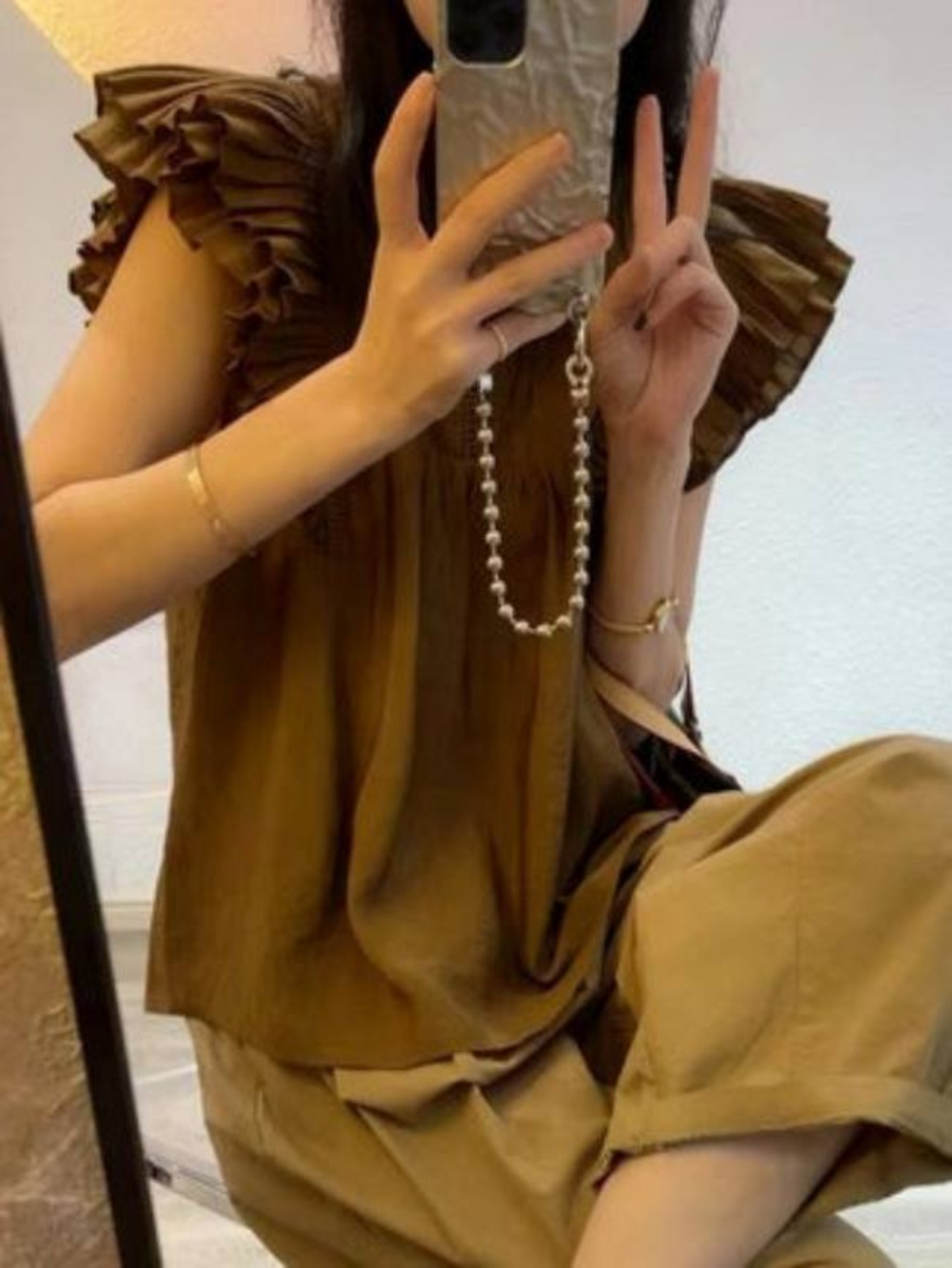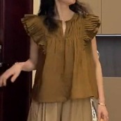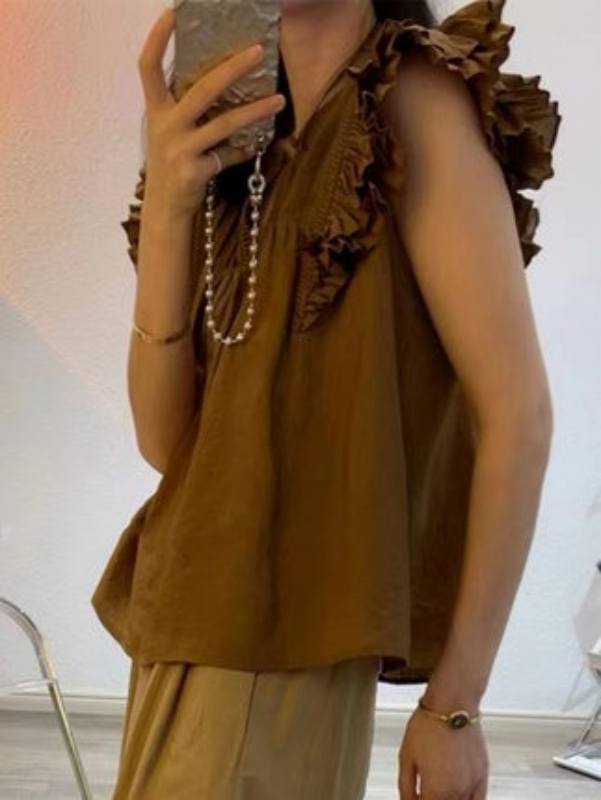 トップス シャツ ブラウス 袖あり フレンチスリーブ キーネック ワイド Aライン フリル ギャザー タック かわいい 大人可愛い きれいめ シンプル カジュアル 大人 上品 おしゃれ お洒落 レトロ 大人女子 こなれ感 ラブリー キュート ガーリー エレガント 抜け感 フェミニン ロマンチック ヴィンテージ 無地 春 夏 10代 20代 レディース 女性用 デート お出かけ 女子会 着回し 普段使い 楽ちん モテ 体系カバー プレゼント ギフト ゆったり 茶色 ブラウン