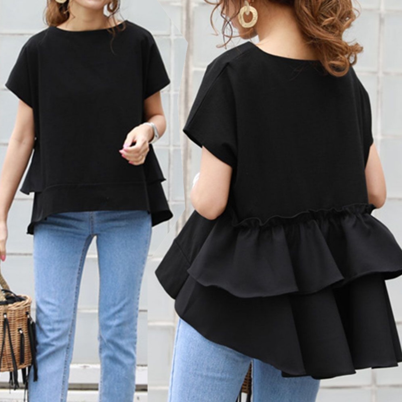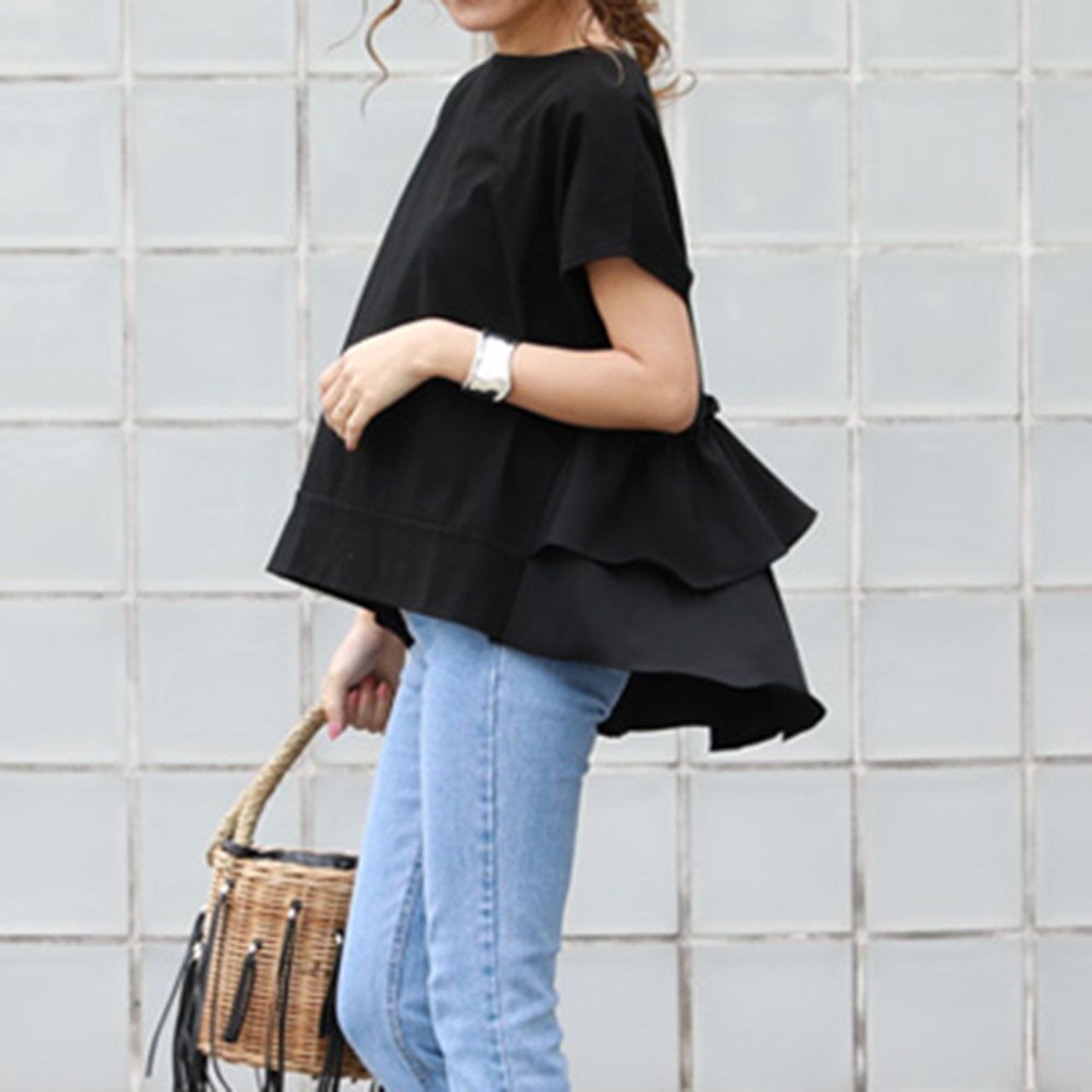 背面の大きなフリルが大人可愛いTシャツです。