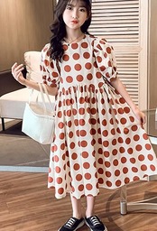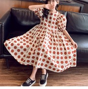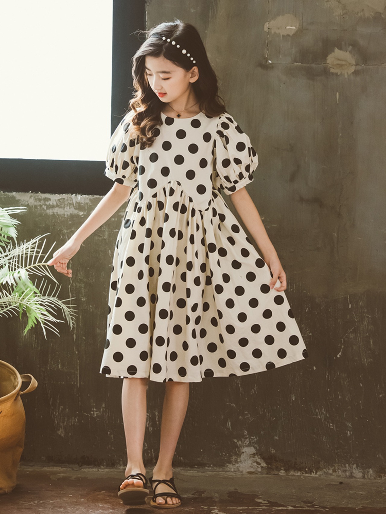 【子ども】ポルカドットのパフスリーブ フレアーワンピース 120 130 140 150 160cm