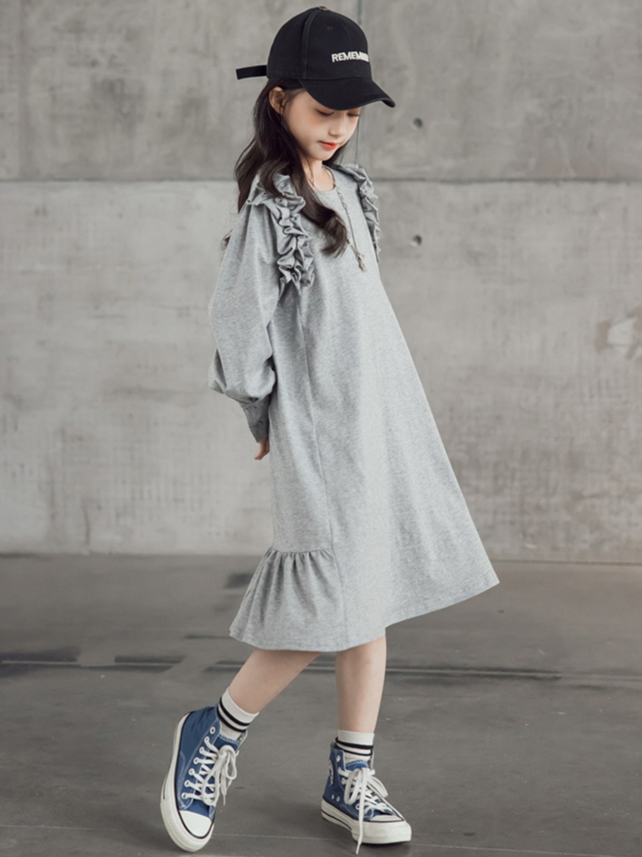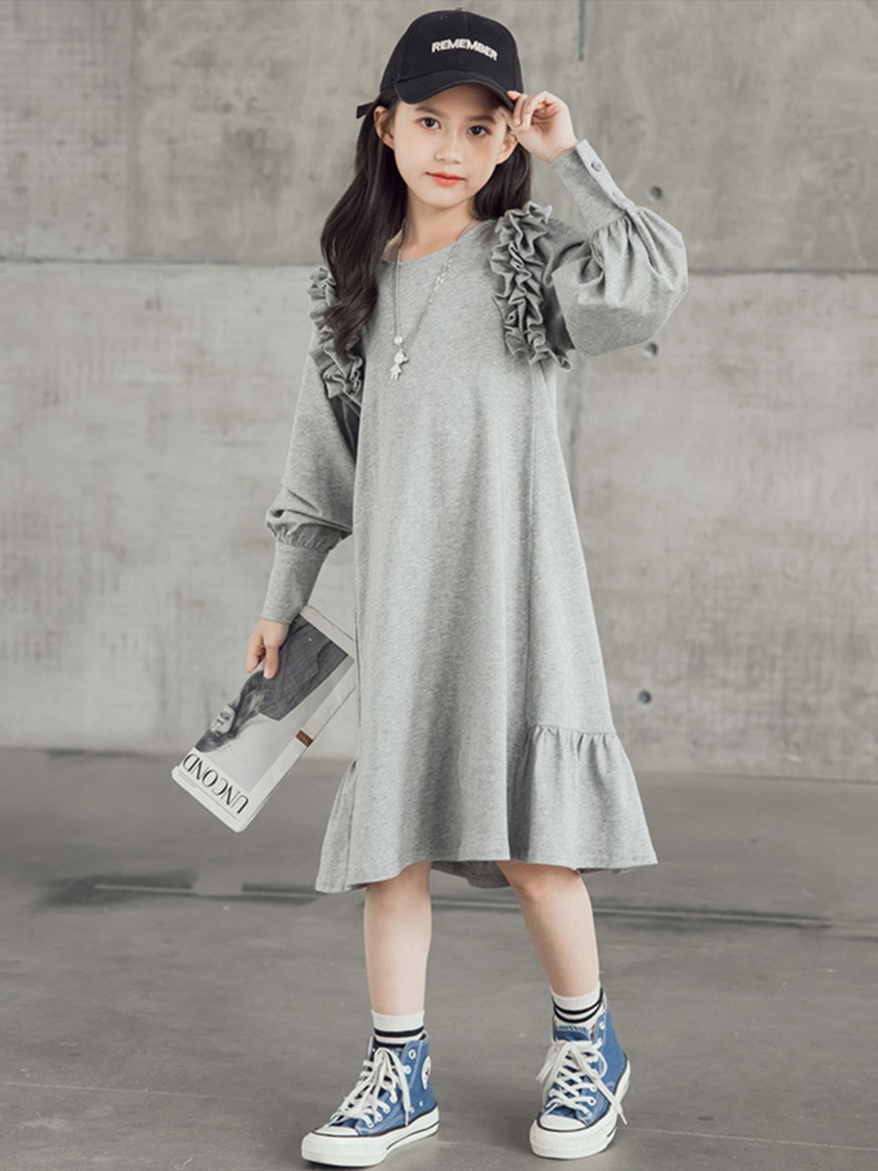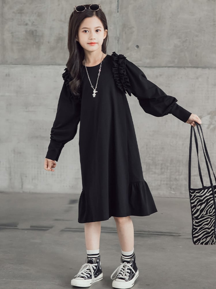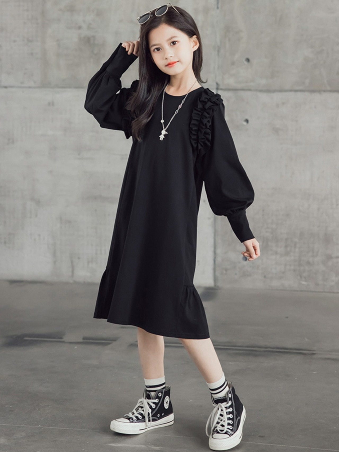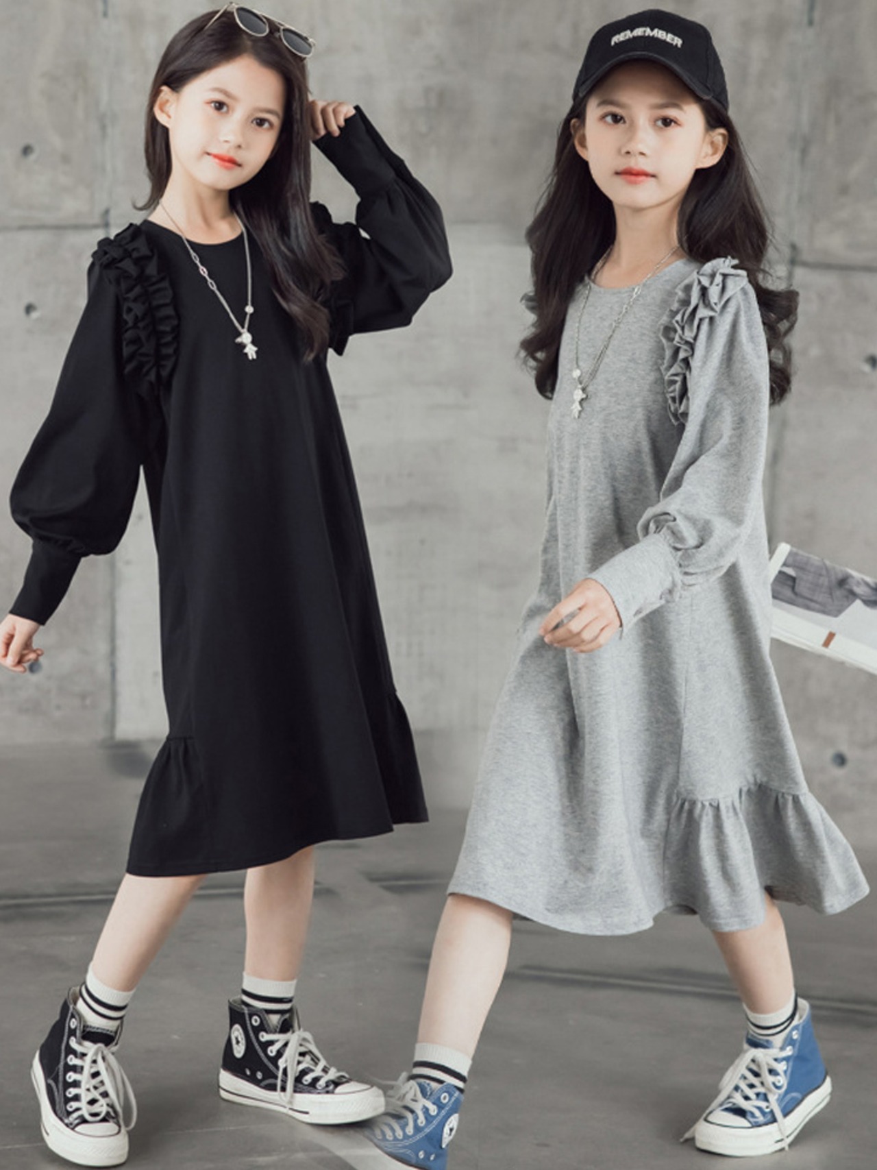 【子ども】女の子 ガーリー モノトーンカラーのフリル付き長袖パフスリーブワンピース クロ グレー お出かけ カジュアル 120 130 140 150 160cm