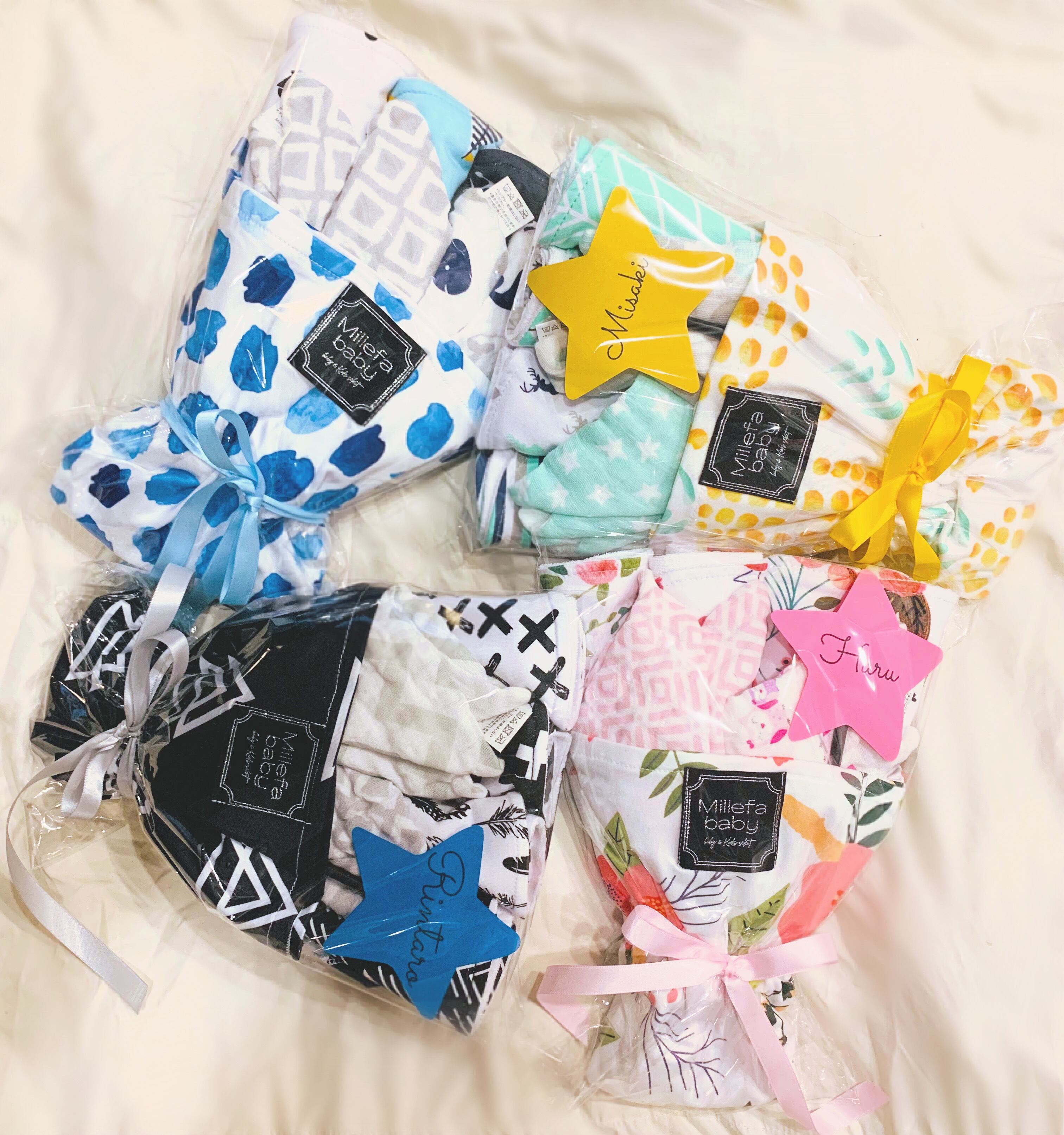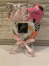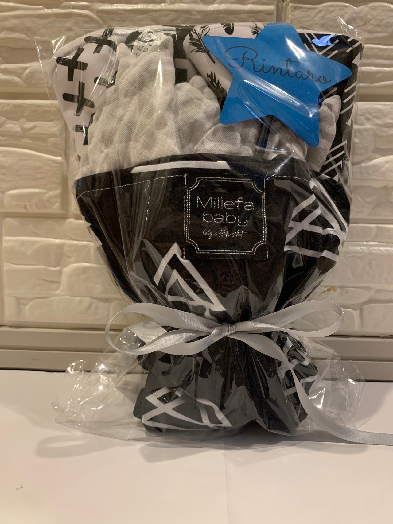 10種類の360度授乳ケープと、4種類のタオルセット、3色のネーム入りプロップスをお好きな組み合わせで、花束風ギフトに仕上げさせていただきます!