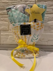 10種類の360度授乳ケープと、4種類のタオルセット、3色のネーム入りプロップスをお好きな組み合わせで、花束風ギフトに仕上げさせていただきます!