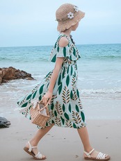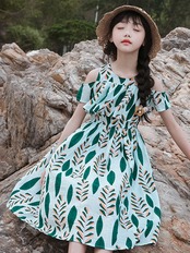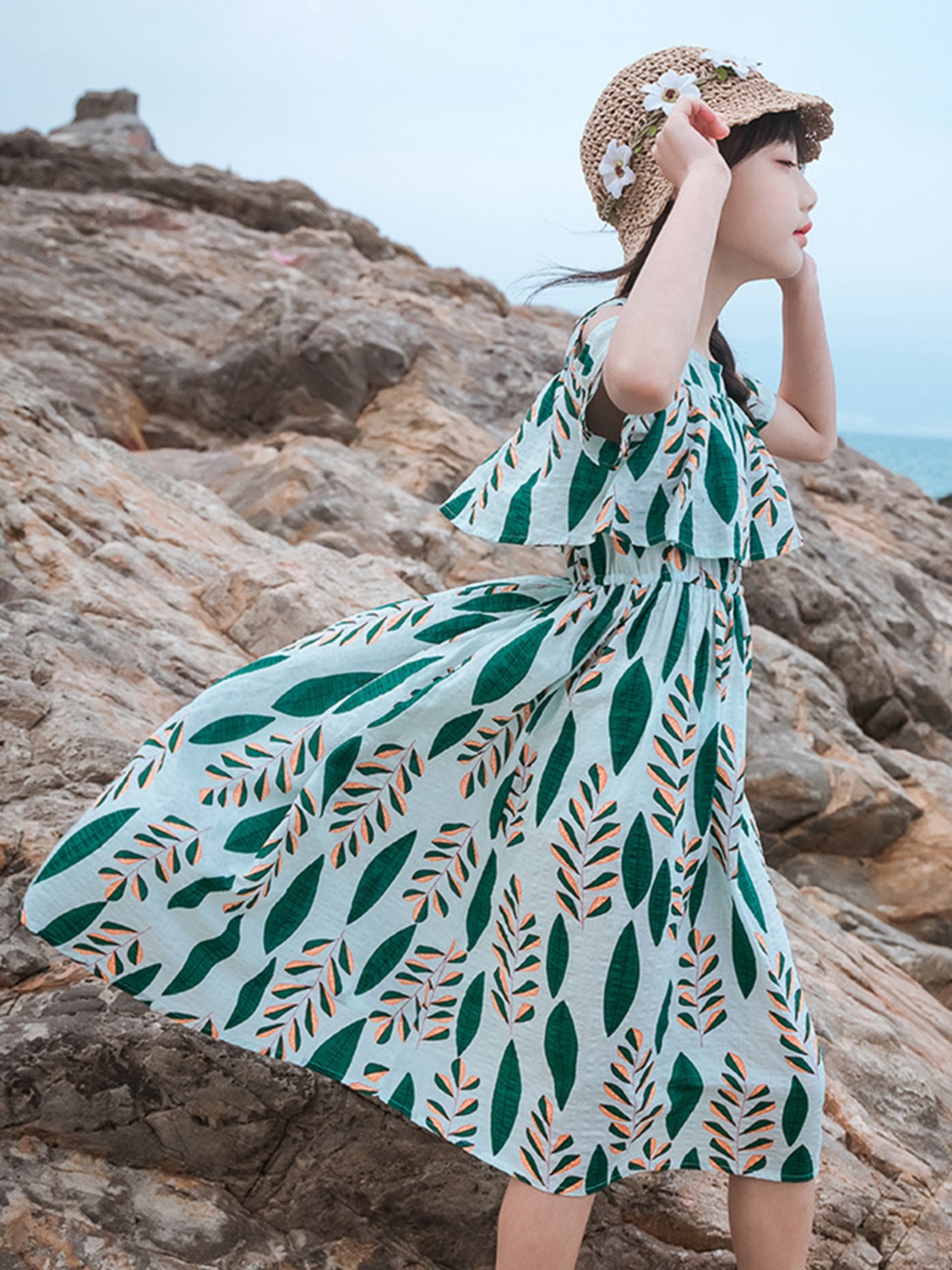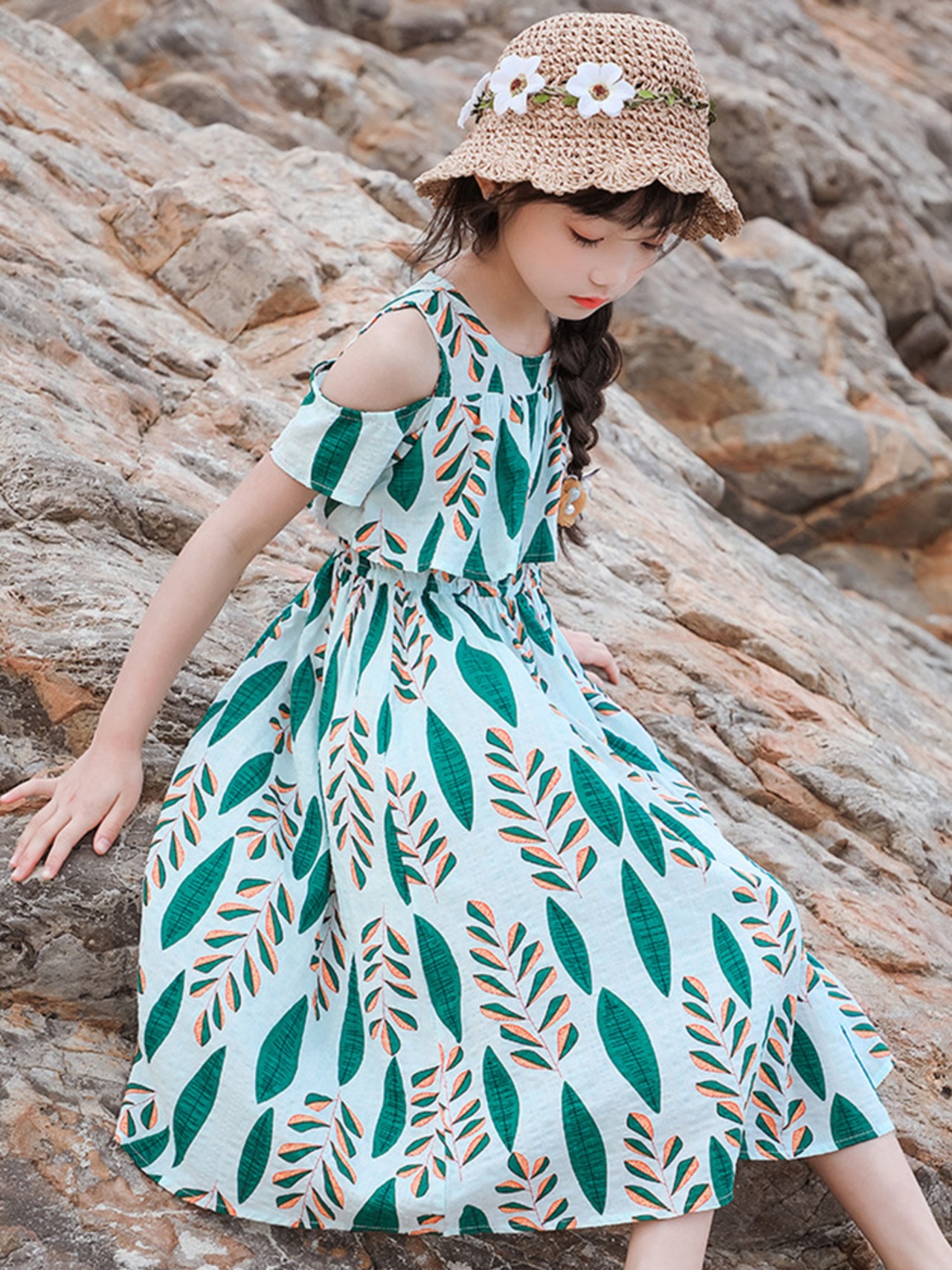 【子ども】テキスタイルデザイン模様のガーリーな肩だしワンピース 120 130 140 150 160cm グリーン系