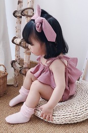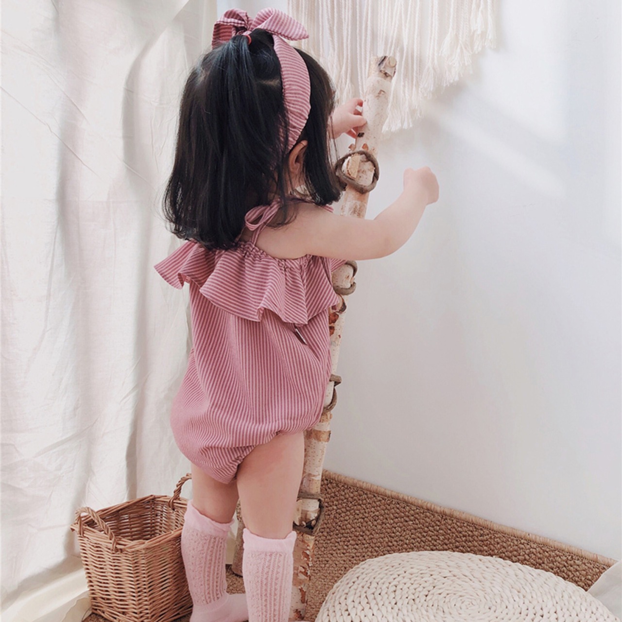 【商品説明】とってもかわいい 赤縦ストライプ柄のヘアバンド付き フリル付きロンパース です。