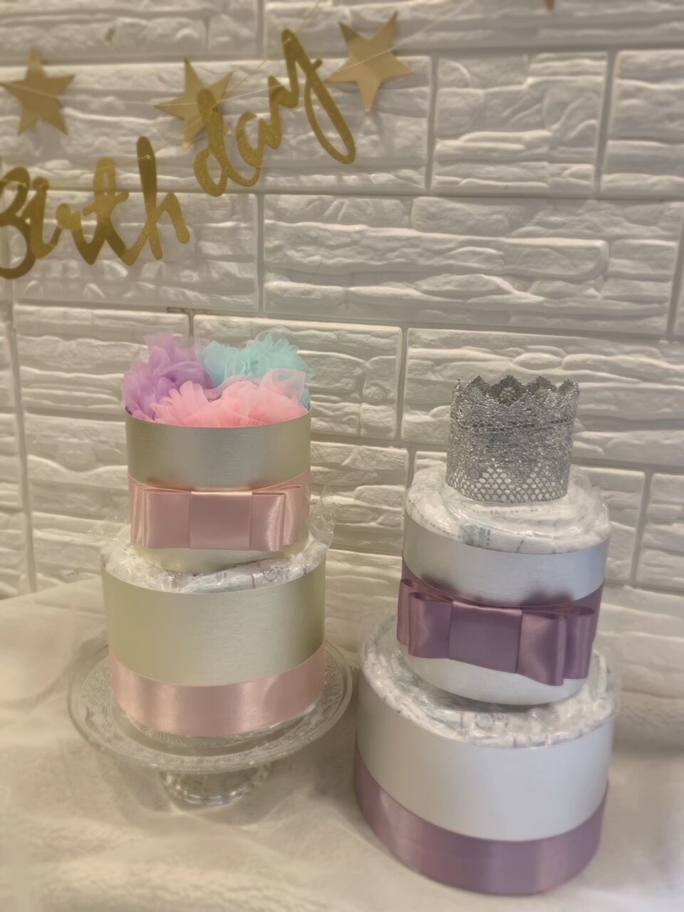 お好きな段数、お色、オプションで組み合わせ可能なおむつケーキです。
