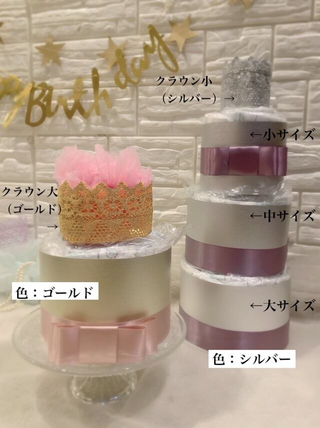 お好きな段数、お色、オプションで組み合わせ可能なおむつケーキです。